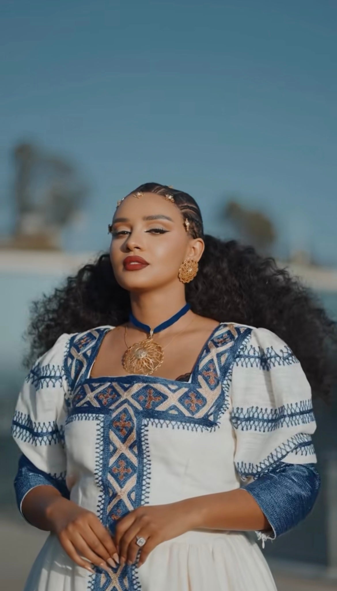 This is not just another Habesha dress—it's a truly unique piece crafted by the talented Liya Fetil, designed for anyone who wants to stand out with elegance and tradition. Made from pure white fabric, the dress immediately draws attention with its clean and graceful look, but what makes it truly special is the rare blue tilet embroidery that gives the dress its signature character.